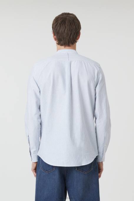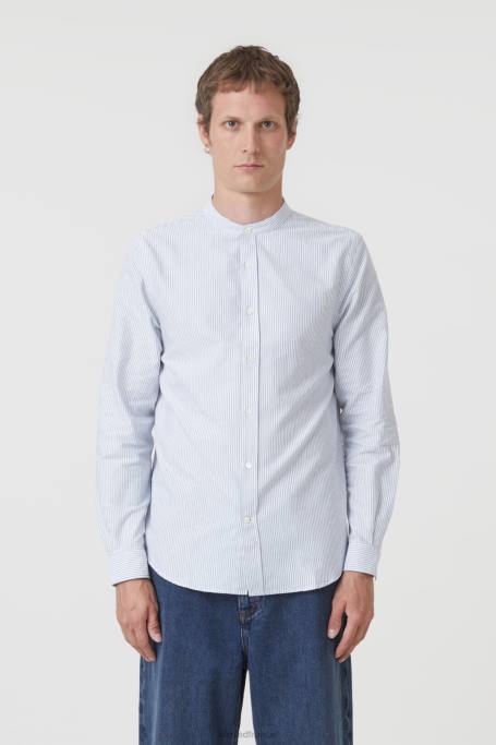 Fabriqué au Portugal. chemise à col debout en coton avec un motif rayé teint en fil. boutons perles et terminaisons à manches avec poignets.