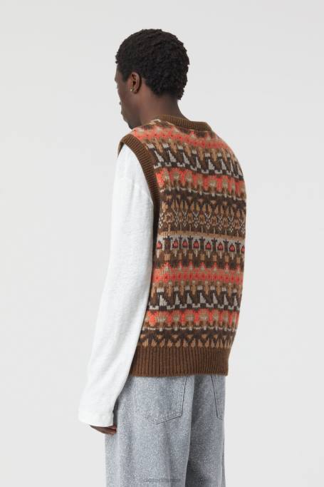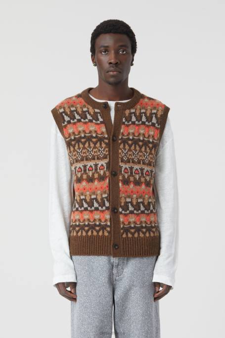 tricoté de laine mérinos très douce (3-5 gg): gilet de pull fait de différents fils italiens fins avec une ajustement régulier et un motif de foire accrocheur. Conception avec un look tricot à la main. avec une bordure de bouton continu avec des boutons avec un look de corne et un ourlet avec des poignets côtelés.